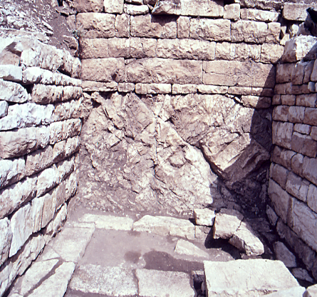 Στο χώρο της αρχαίας πόλης αποκαλύφθηκε τμήμα πλατιάς σκάλας-δρόμου, κατασκευασμένη από πλακαρές πέτρες, που θυμίζει τα νεότερα καλντερίμια, καθώς και κλίμακες ανόδου. Μία κλίμακα ανόδου οδηγούσε σε υπερκείμενο οικοδόμημα, στο εσωτερικό του οποίου εντοπίζεται πήλινος αγωγός δικτύου ύδρευσης. Στα νότια και σε χαμηλότερο επίπεδο αποκαλύφθηκε μικρή πλατεία με δάπεδο κατασκευασμένο από πλακαρές πέτρες.
