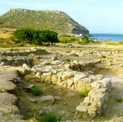 At the northernmost edge of the eastern coast of Crete lie the ruins of a settlement which flourished during the Late Minoan period (1550-1220 B.C.). At the same site, however, are preserved remains of the Early and Middle Minoan periods (3000-1550 B.C.), mostly cemeteries with well-built ossuaries, and ruins of spacious houses. The site ceased to be inhabited at the same time when Zakros was abandoned (1450 B.C.) but was reoccupied during the Late Minoan III period (1300-1200 B.C.). The city covered a total area of more than 50,000 sq.m., was densely inhabited but not fortified.