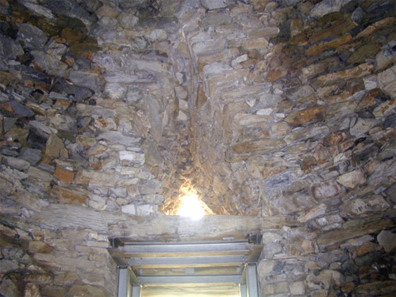 The tomb was accessed through a downhill dromos (entrance passageway) 14.50m of length and 3.30m of width. The front of the dromos was retained by 1m wide stone walls slightly converging to the grave’s stomio (doorway into burial chamber); at the point of junction with the tholos they reach up to 5.70m of height. After the burial, the end of the dromos was sealed with a 2m wide stone wall. Entrance into the tholos (funerary chamber) was achieved through a stomio (3m of height, 2.20m of length and 1.90m of width) covered with four large slabs used as a lintel and narrowing on the interior; over the lintel was a relieving triangle. The tholos, 8.20m in diameter and 8.10m high, was built in the load displacing technique, probably with the help of centerings, whose traces are not visible. It is composed of small non-cemented lime stones of irregular shape; the base stones are strengthened. The limestone rock was flattened in order to shape the floor. The upper part of the tholos was sealed by a large circular slab, the keystone, which had collapsed onto the floor in earlier times and was put back to its place again. Despite the grave’s looting, a minor number of important findings, mainly glass jewels, ivory artefacts and bronze weapons, were transferred to the National Archaeological Museum [of Athens] and make part of its actual exhibitions. According to the first excavators of the monument P. Wolter and H. Lolling, the interior tholos wall was skirted by a low bench, 0.55m of height and 0.50m wide, composed of five courses of unfired bricks. That bench does not survive today and there is no drawing of it either. Christos Tsountas considered this a depository for the body of the defunct and for grave gifts. During the recent floor clearing, under the bench was found a double cutting into the bedrock, single-stepped and 0.60m deep, used for the burial of four dogs.