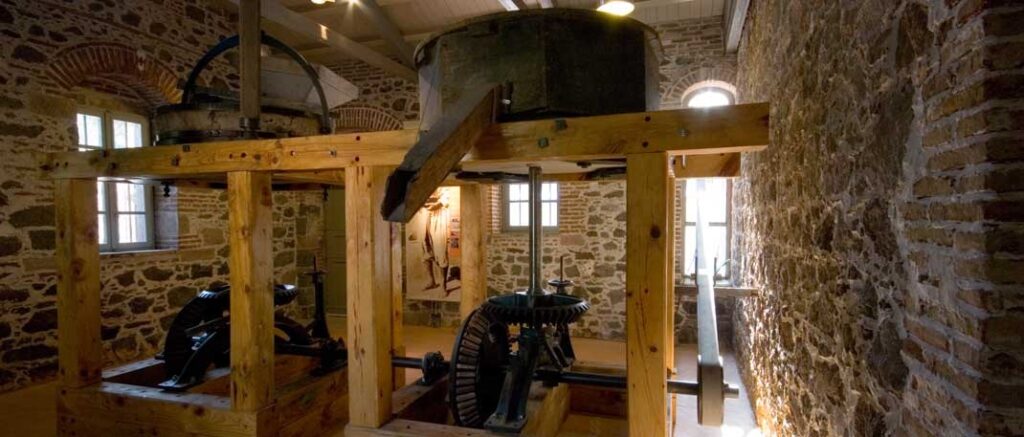 The Agia Paraskevi complex has been developed as ?an oil-mill turned into a museum of an oil-mill?, restoring both its architectural and mechanical features to their original condition. The old machinery and equipment that have been preserved, and fully restored, are being exhibited in a unique way by being put into use for demonstration?s sake, which is supported by digital shows. One can witness the development of the various machines, while special emphasis is given to the changes the introduction of mechanical power brought into the process of oil production. In the main building the three basic steps of the oil production process (crushing the olives, pressing the olive-pulp, separating oil from water) are shown, while reference is made to the auxiliary operation of the flour-mill.
